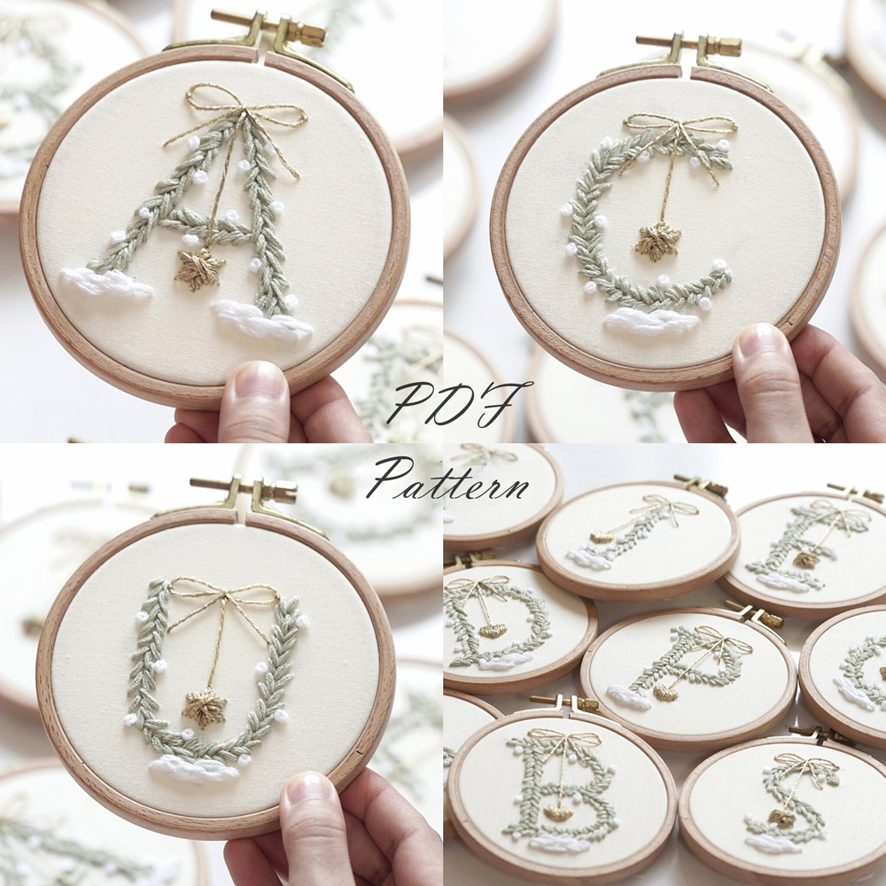 1- PDF Pattern 1 (8.3 x 11.7 in / 21 x 29.7 cm): Included 26 letters A-Z with 2 styles, sized for a 4”/10cm round embroidery hoop with detailed instructions for printing using Adobe Acrobat Reader.